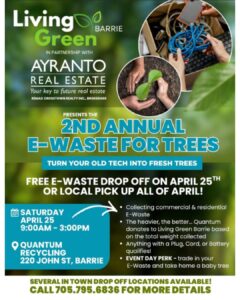 Now’s the perfect time to gather up your old electronics and keep them out of the landfill! Recycle your e-waste and help fund Living Green Barrie’s 10,000 Trees Program. Plus, drop off your e-waste and take home a baby tree as a thank-you!